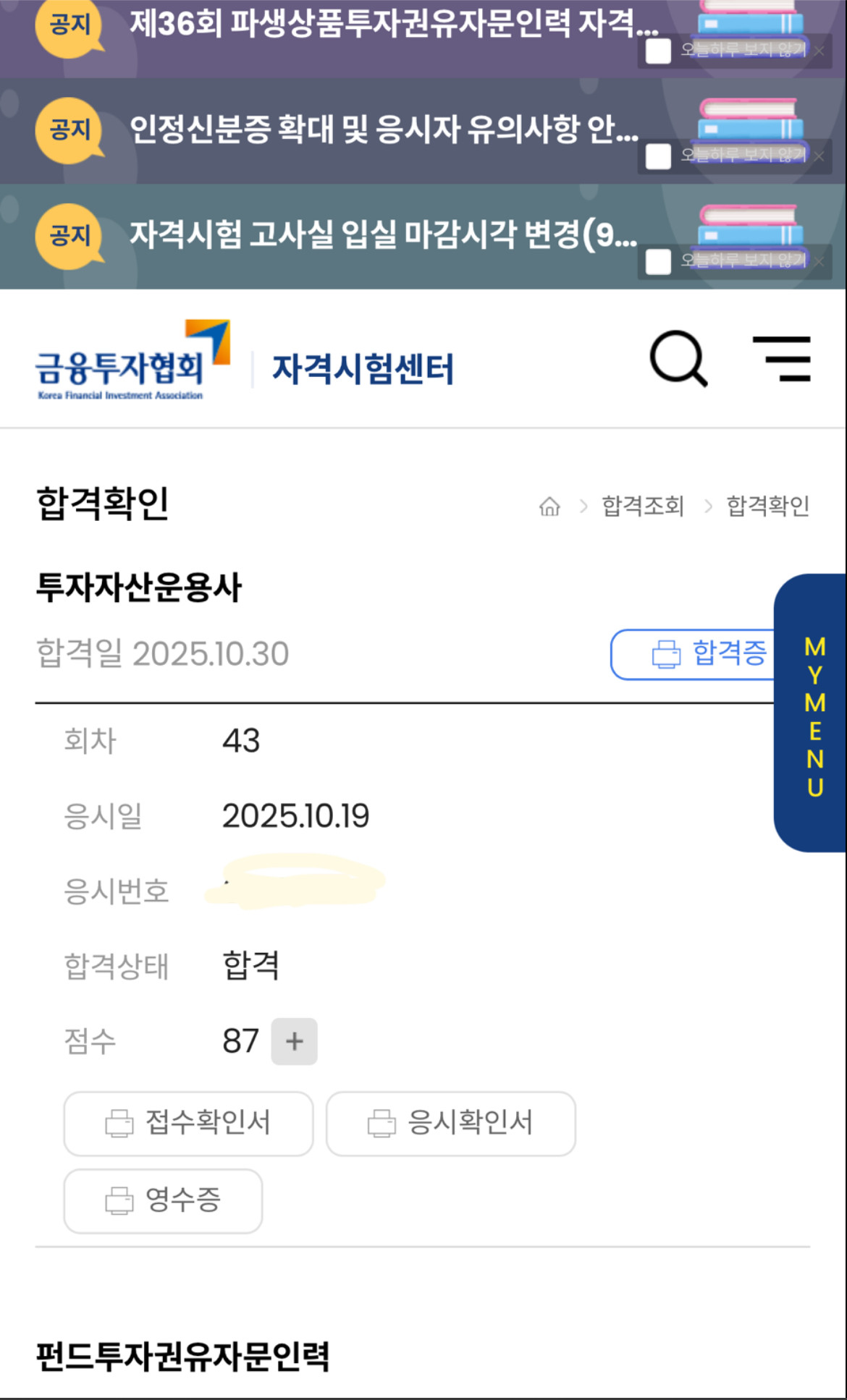 금융권 재직자로서 자산관리 역량을 강화하고 싶다는 목표로 투자자산운용사 시험에 도전했습니다. 첫번째 도전으로 87점으로 합격했습니다.