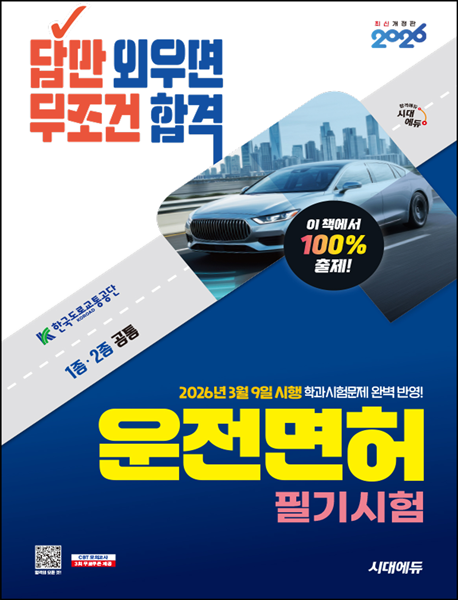 이 책은 한국도로교통공단에서 제공한 최신 문제를 수록한 최신판 도서로, 2026년 3월 9일부터 시행되는 문제들이 모두 수록되어 있습니다. 운전면허 학과시험 문제는 이 문제집에서 100% 출제됩니다. 시대에듀가 준비한 답만 외우면 무조건 합격 운전면허 필기시험으로 단숨에 합격의 기쁨을 맛보시길 바랍니다.