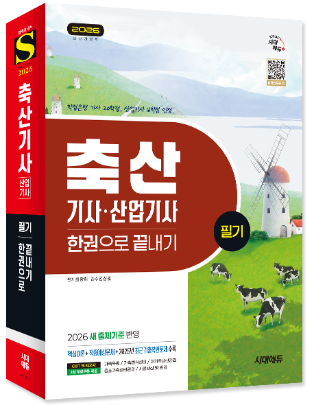 2026 시대에듀 축산기사·산업기사 필기 한권으로 끝내기는 최신 출제기준에 맞춘 과목별 이론과 적중예상문제 그리고 가장 중요한 기출복원문제와 자세한 해설로 축산기사·산업기사 필기시험에 완벽하게 대비할 수 있도록 구성한 축산 분야 자격증 교재입니다.